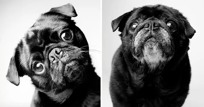 La colección de fotografías incluye a perros de distintas razas. Las primeras imágenes muestran a cachorros enérgicos y torpes, con la piel brillante y expresiones de alerta. Los retratos de una década más tarde cuentan una historia diferente, con los perros descansando y las huellas de la edad en su piel.