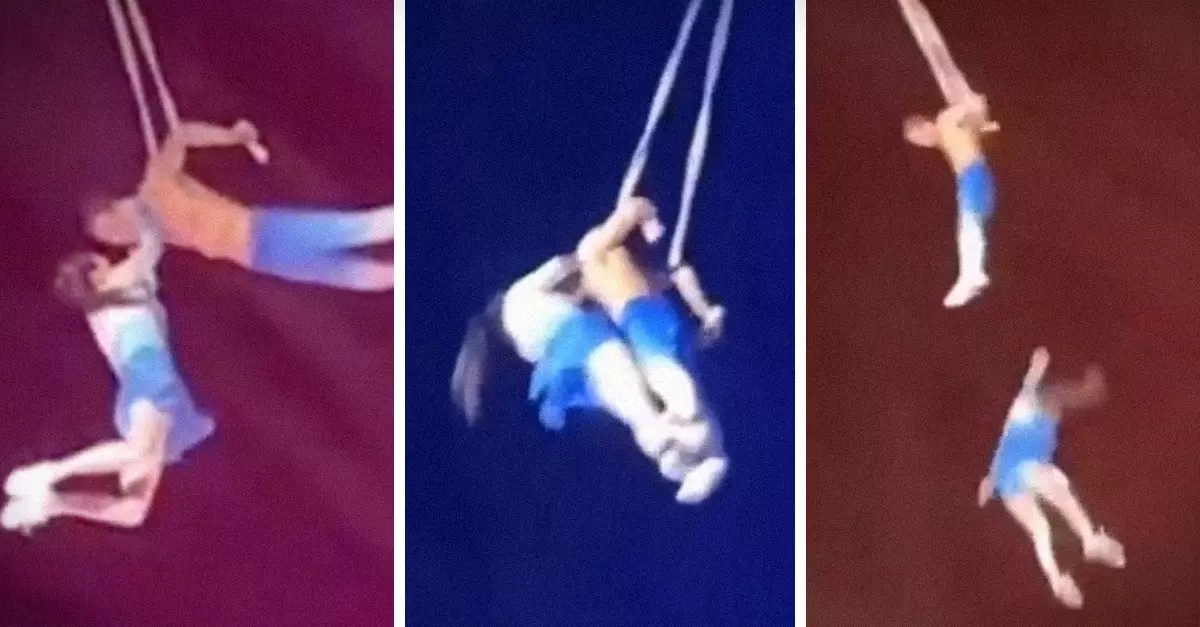 El video que circula en las redes sociales y que fue compartido por la activista Jennifer Zeng muestra el momento en que la pareja es elevada en los aires por medio de una grúa, sostenida por el cable de donde está amarrado el trapecio.