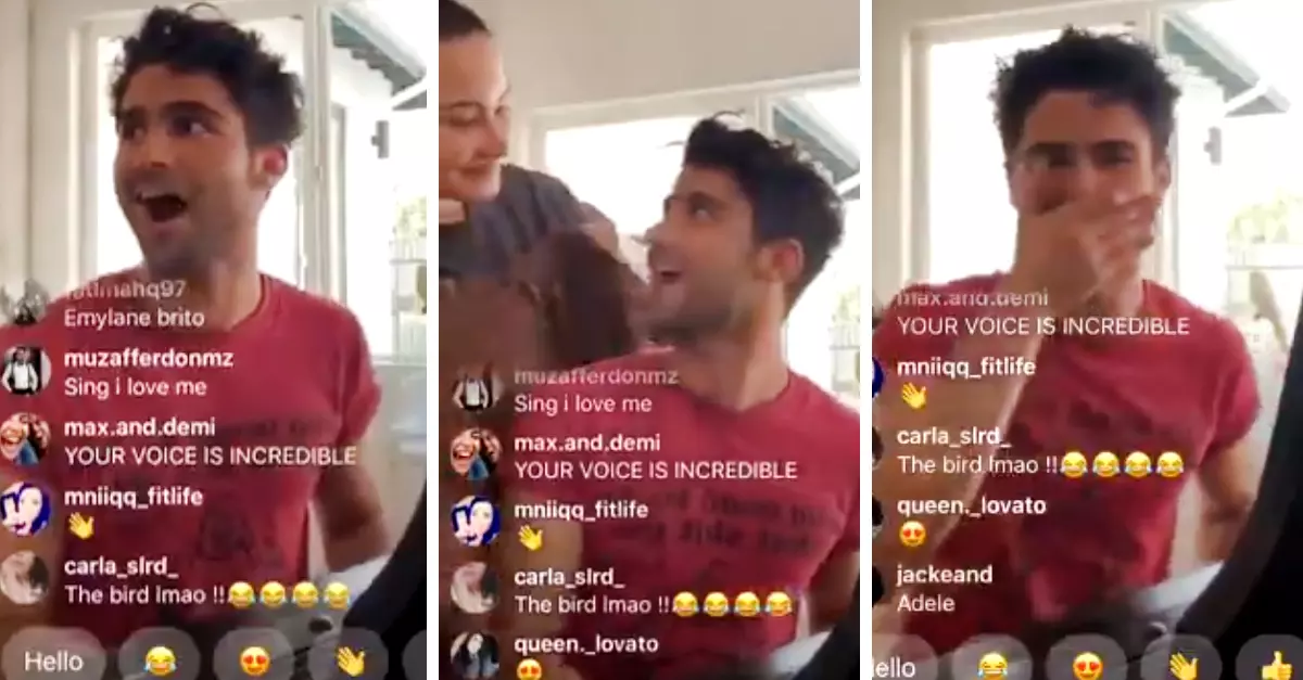 Mientras el también cantante Max Ehrich estaba transmitiendo en vivo en Instagram un concierto para sus fans, se pudo observar como Demi caminaba hacia él con una frazada para cubrirlo. Aunque Max le hizo gestos para que no se acercara ya era muy tarde, pues las personas que estaban viendo la transmisión la vieron.
