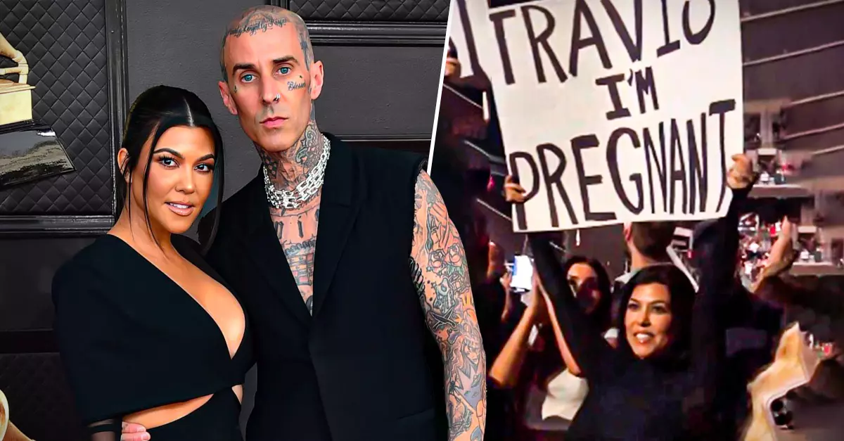 Durante pleno concierto de la banda Blink-182, de la que Travis es baterista, Kourtney comenzó a saltar en su lugar, sosteniendo con las manos un cartel en alto donde se leía la frase: “¡Travis, estoy embarazada!”.