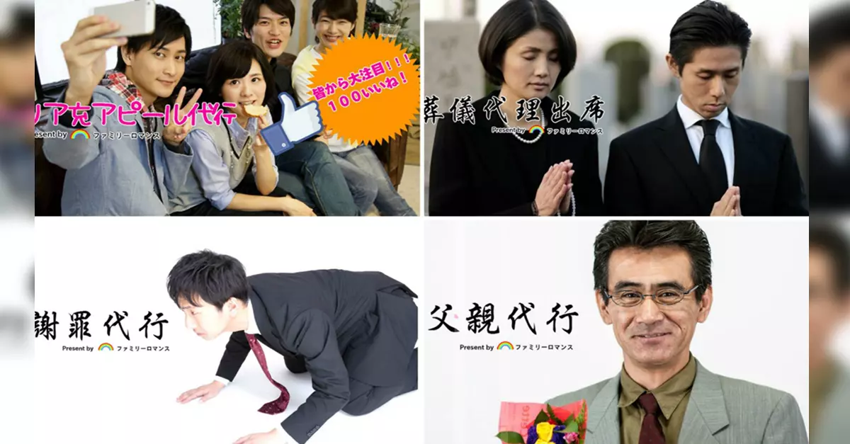 Family Romance es la empresa de renta de personas más famosa. Entre sus servicios tiene “personal experimentado que ofrecerá más que placer real” al asistir como invitado a una boda; llamadas matutinas “para empezar el día con una atención”; grupos de jóvenes para simular una fiesta y “obtener muchos me gusta” en redes; una esposa para una cena con clientes y hasta una persona que puede “regañarte o ayudarte a reflexionar si hiciste algo mal”.