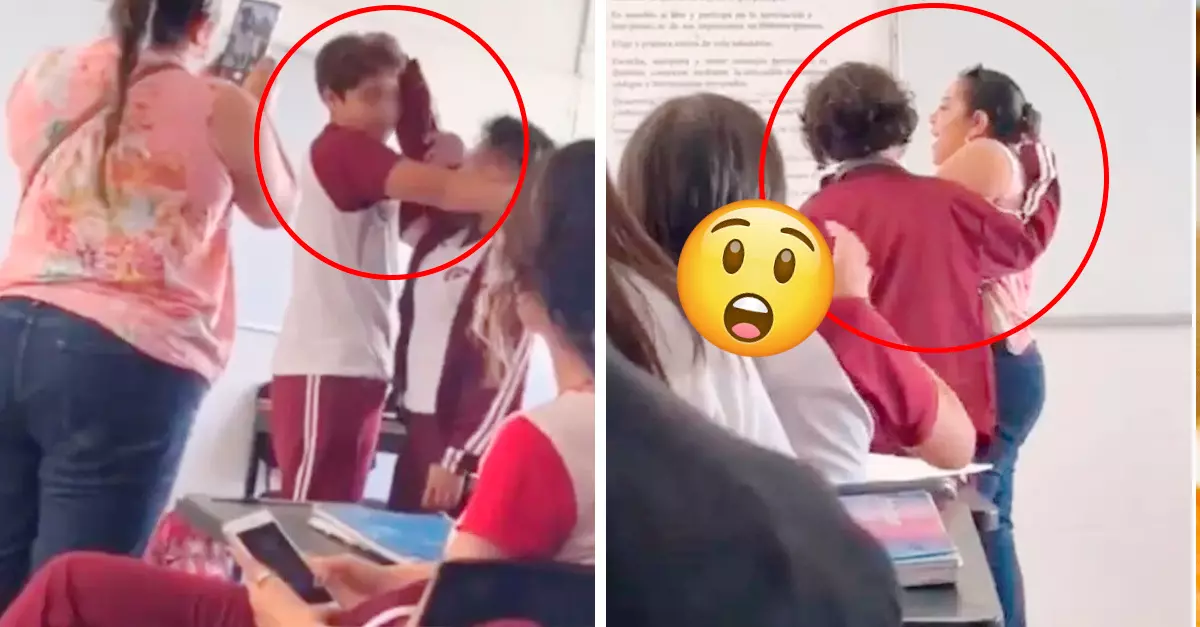 En un video que circula en las redes sociales se puede ver a ambos estudiantes agrediéndose físicamente en el interior del salón y frente a todo el grupo, mientras que la docente también graba el momento.