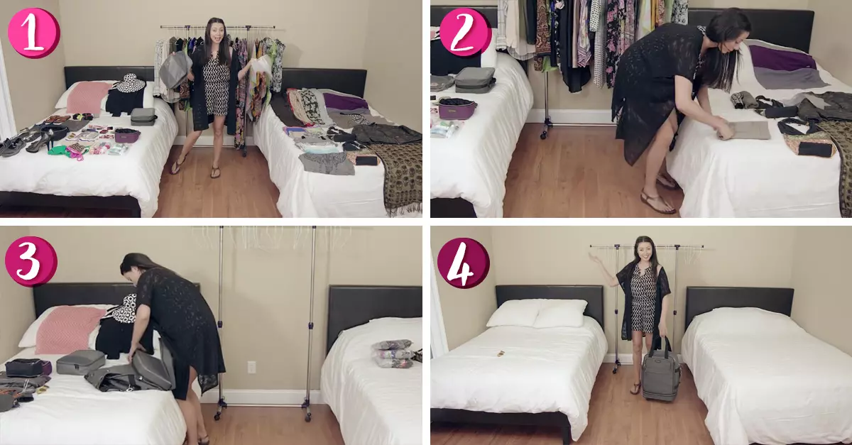 Todo lo que tienes que hacer es hacer rollo tu ropa y colocarla en bolsas; meter los calcetines dentro de tus zapatos, amarrar tus tenis y objetos sueltos con una liga y listo. Ella lo hace ver increíblemente fácil. ¿Lista para intentarlo?