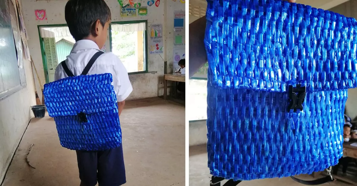 Un papá originario de Camboya elaboró una mochila para su pequeño a causa de no tener los recursos necesarios para comprarle una.