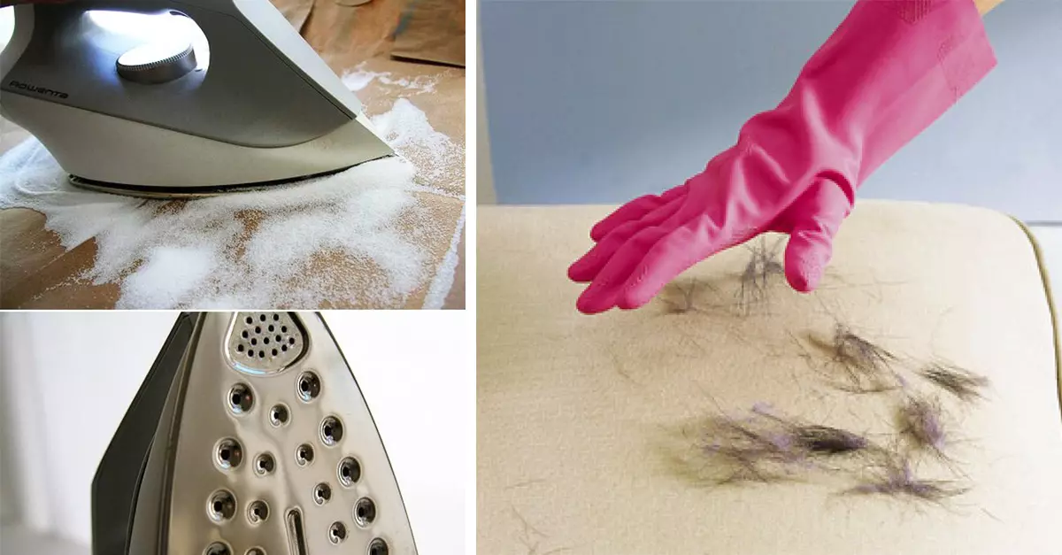 ¿Sal? ¡SÍ! Sólo coloca un poco de sal en tu tabla para planchar (tal vez sobre una funda de almohada o cualquier superficie donde sea fácil de deslizar) y después coloca la plancha en la opción de vapor y pásala sobre la sal. La suciedad de la plancha se despegará inmediatamente con la sal.